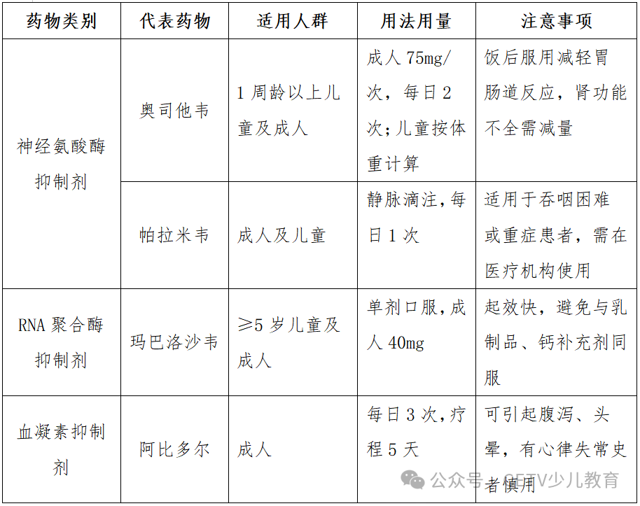 抗病毒药物是流感治疗的关键,目前诊疗方案明确了三类有效药物,需根据人群选择: