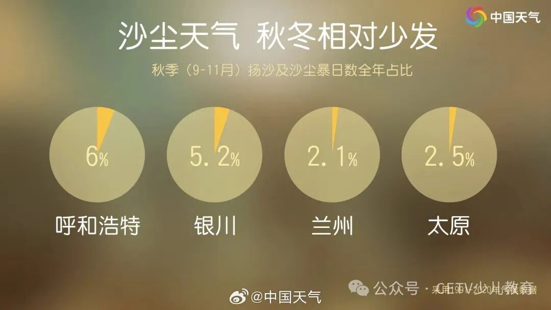 大城市中,呼和浩特、银川常年9至11月出现扬沙及沙尘暴的日数在全年占比分别达到6%和5.2%。