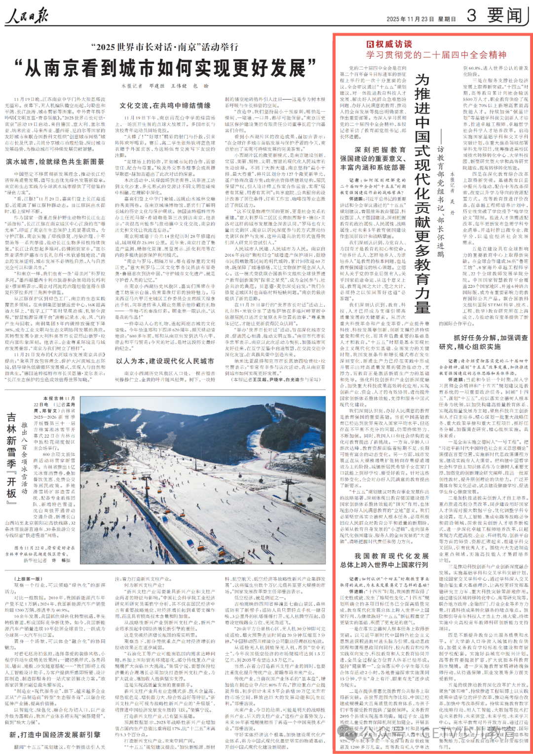 11月23日,《人民日报》“权威访谈·学习贯彻党的二十届四中全会精神”栏目采访教育部党组书记、部长怀进鹏。