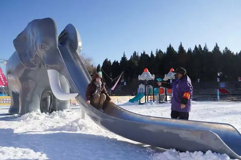 作为二环内最大的戏雪乐园,陶然亭公园拥有3.8万平方米的超大雪场,王企鹅、帽带企鹅、巴布亚企鹅组成的巡游队伍憨态可掬,成为萌趣担当。而最引人注目的莫过于南湖中央复刻亮相的大象滑梯,这座暂别公众视野的童年标志性设施焕新回归,让不少市民直呼“穿越回童年”。