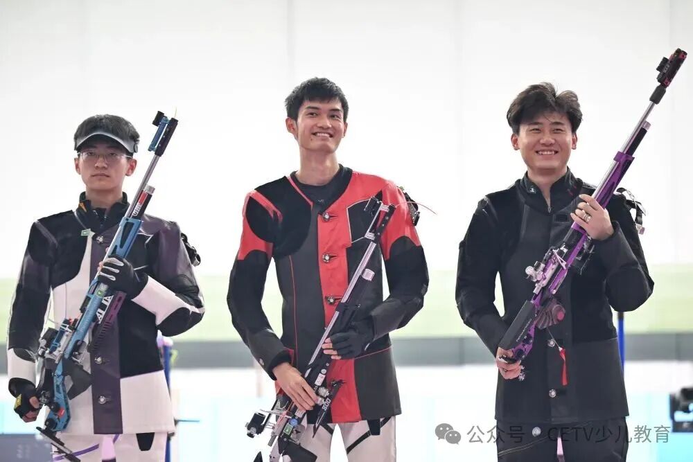 10月14日,第十五届全运会射击男子10米气步枪决赛在广州举行,冠军江苏队选手盛李豪(中)、亚军吉林队选手王雨桐(左)、季军陕西队选手刘宇坤在赛后合影。新华社记者 丁磊 摄