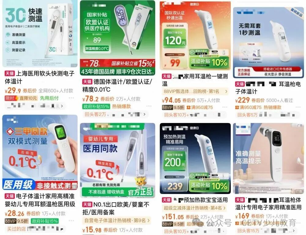 从电商平台数据来看,水银体温计价格普遍在8-15元之间,无汞体温计在20元左右;入门级电子体温计售价多集中在15-40元,高端产品价格在100元以上,而红外体温计价格差距尤为明显,有几十元、百元左右的,高端款如某进口品牌产品券后价可达300多元。